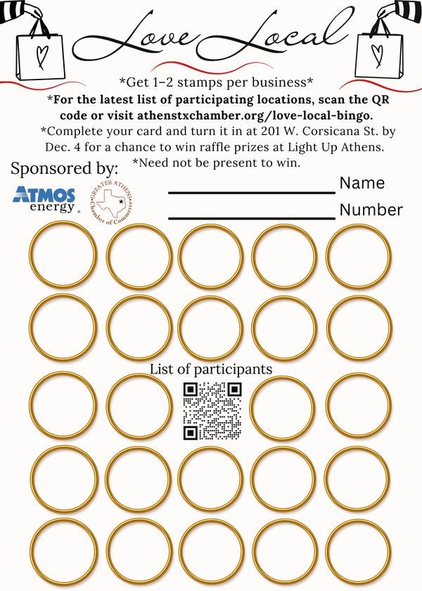 Turn in your fully stamped Bingo card to the Chamber at 201 W. Corsicana St., Athens before Dec. 4